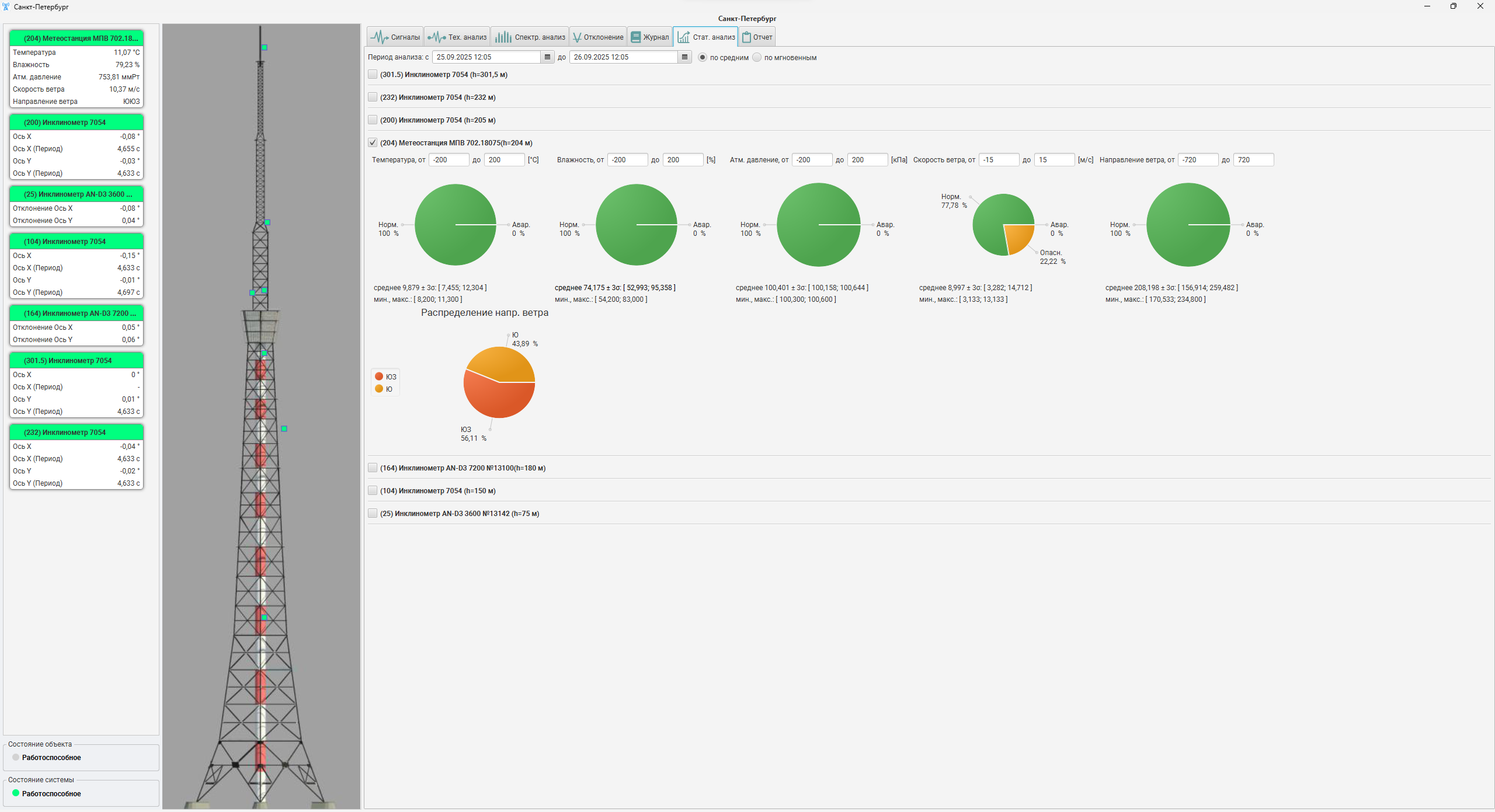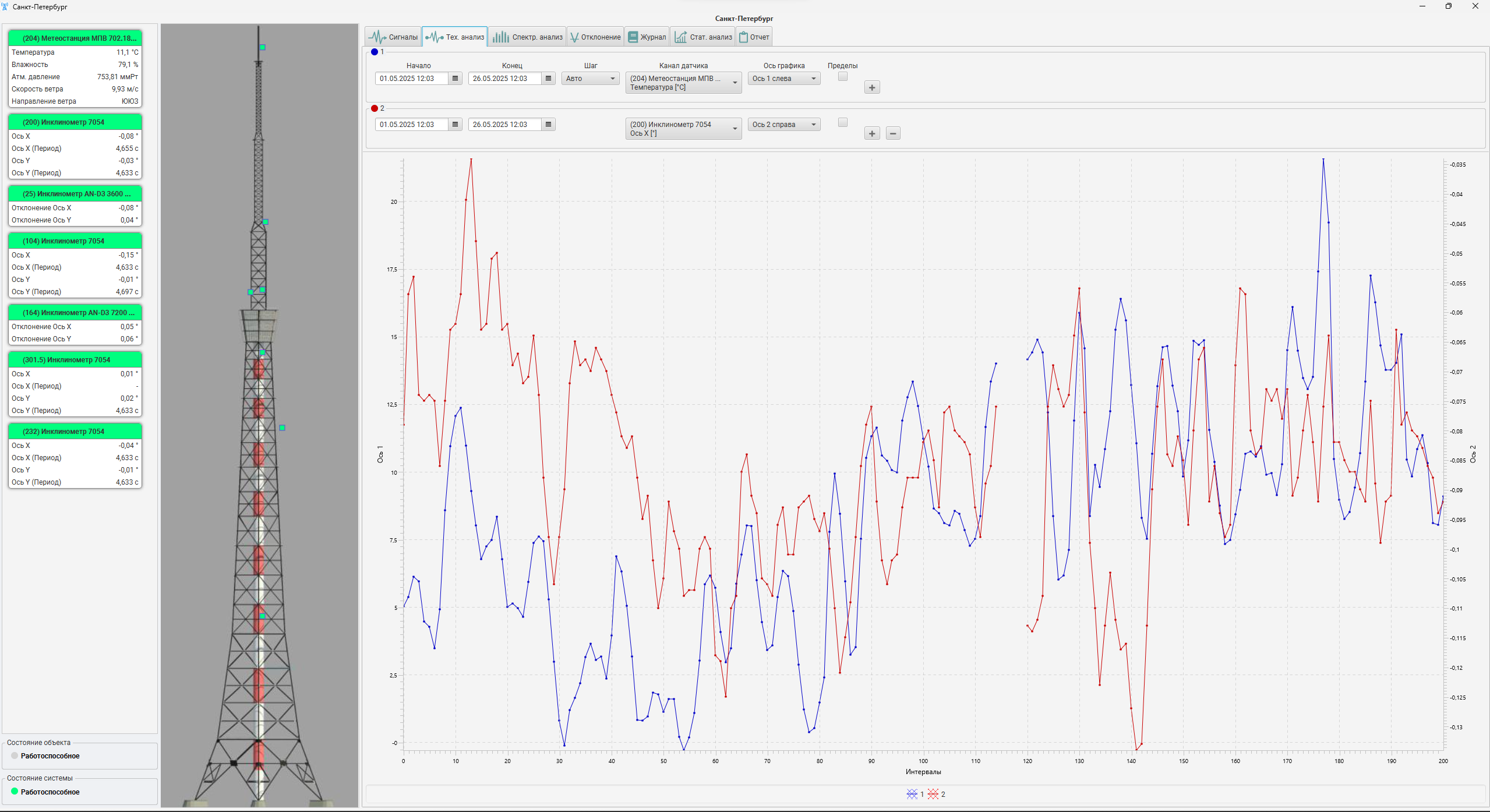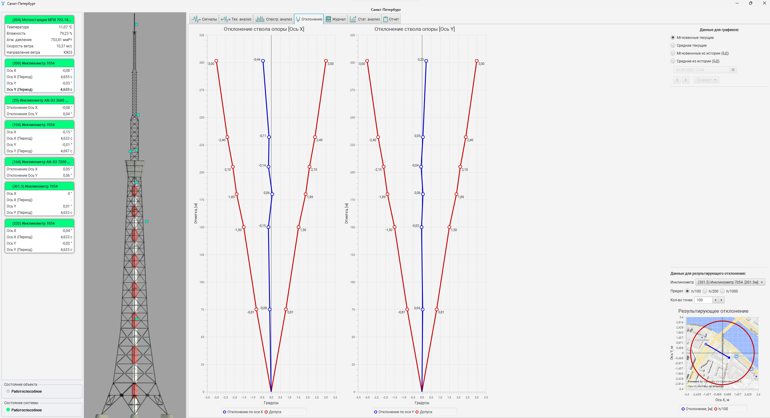 Данные поступают в режиме реального времени и синхронизируются между собой, что позволяет учитывать влияние внешних факторов на поведение конструкции.