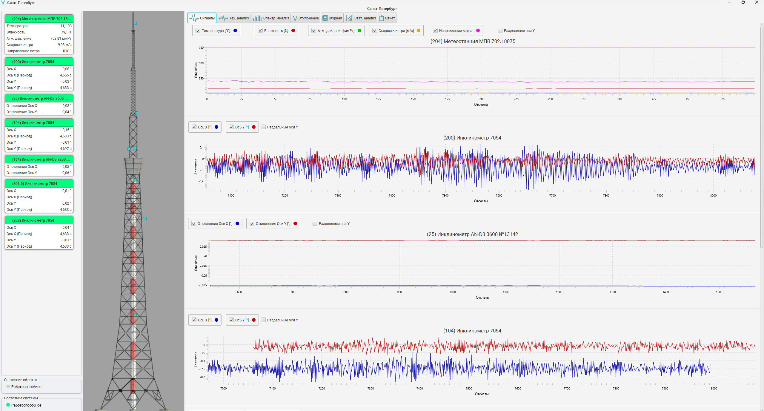 В левой части интерфейса представлена схематическая модель сооружения с отображением всех установленных датчиков.